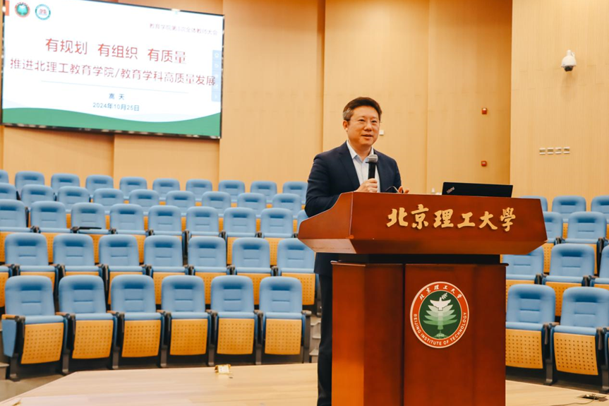 会上,嵩天以《有规划、有组织、有质量,推进北理工教育学院/教育学科高质量发展》为题作学院工作报告。他首先总结了学院建院以来的工作以及展现出的新发展格局,随后通过指标分析和未来举措介绍了教育学院新发展道路和高质量发展体系建设,绘制了学院未来发展蓝图。他用数据、案例和实践,系统总结了全国一流教育学发展的三条路,并从特征、路径和具体举措各个维度系统阐释了“理论大实践办教育”的北理工教育学的第四条发展道路。他指出,北理工教育学科要突出优势特色、突破传统路径、突显战略引领,走好教育学科三大战略,通过实干兴邦、深度文工融合,构筑真正学科影响力。