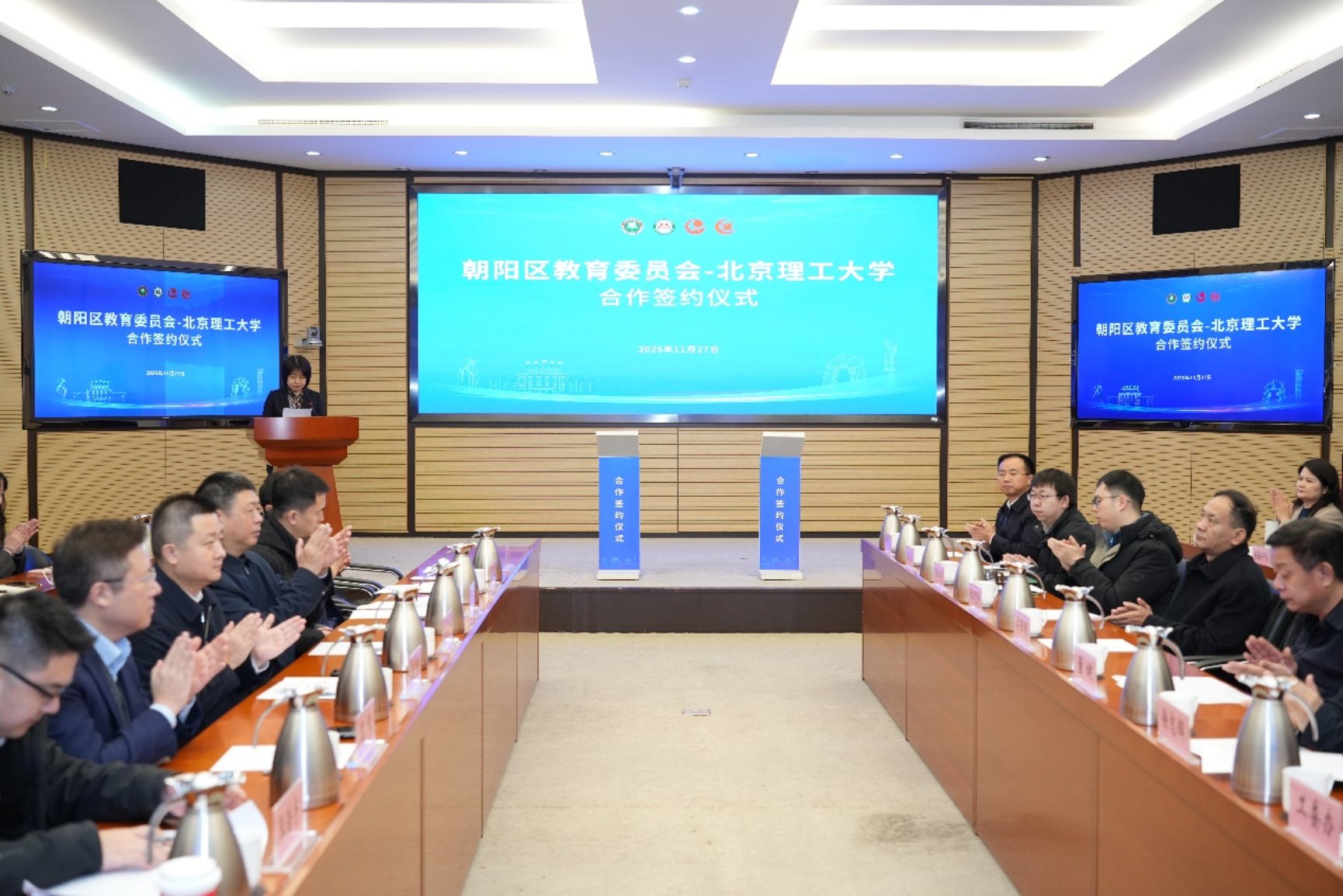 北京理工大学党委副书记杨帆、教育学院党委书记李汉军、教育学院院长兼党委副书记嵩天,以及朝阳区委教育工委书记董健、朝阳区教育委员会主任徐志辉等领导的共同见证下,北京理工大学教育学院与朝阳区教育委员会签署了合作框架协议。教育学院与朝阳区青少年活动中心签订合作协议。北京理工大学与北京中学、北京市第八十中学、北京市陈经纶中学、北京市和平街第一中学签订了“国优计划”教研实践基地协议。北京理工大学党委副书记杨帆为五家合作单位授牌,标志着校地协同、共育卓越师资与创新人才的新篇章正式开启。实现了高校、地方、中学协调联动,构建了全方位、多主体的协同育人路径,为未来教师队伍的数字素养提升注入新的活力。